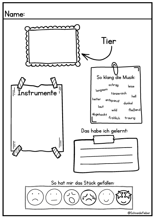 - Das neue Stück wird angehört. Die SuS überlegen, zu welchem Tier die Musik passen könnte.